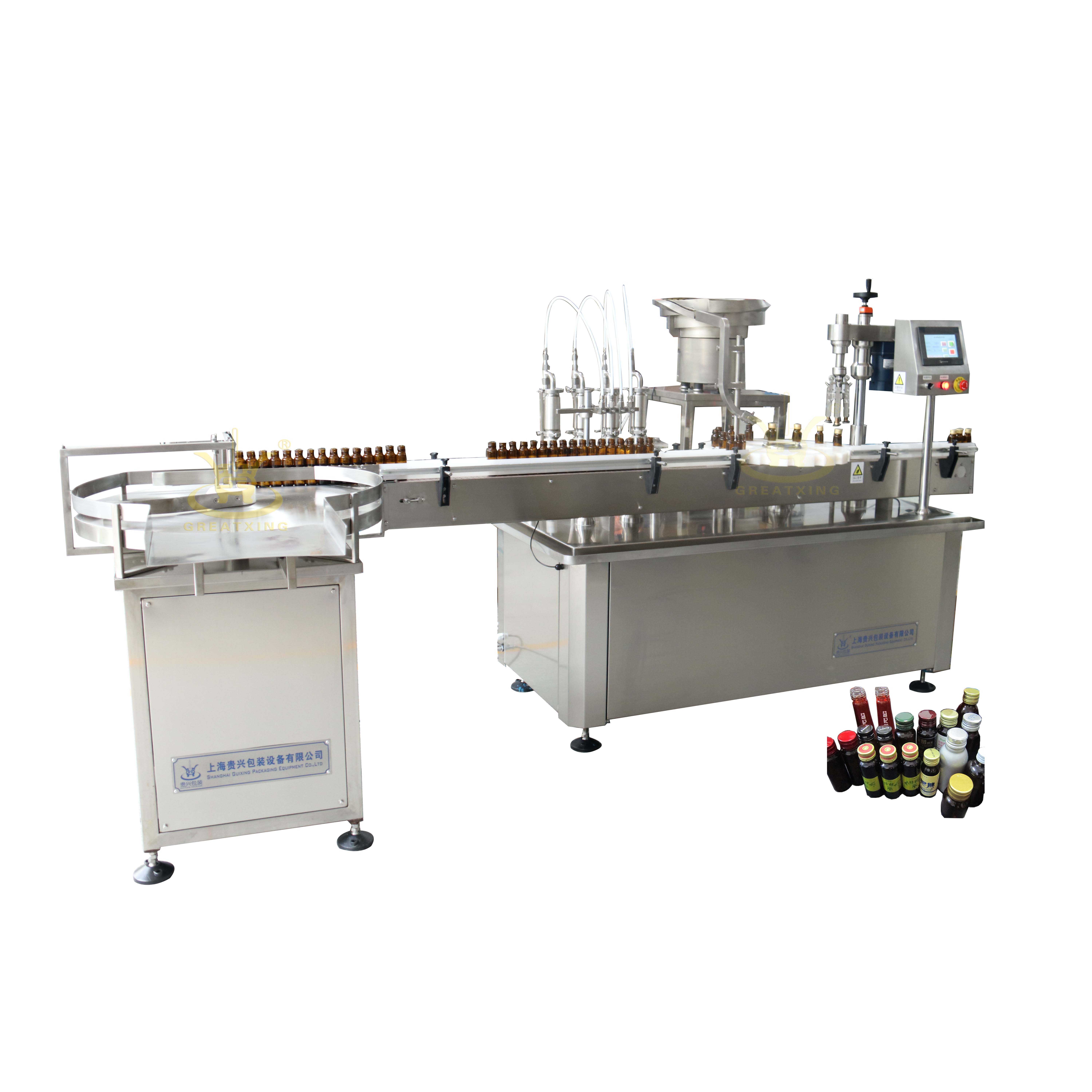 This machine is mainly used for easy pull cover oral liquid bottle filling, sealing, reasonable design, stable performance. The machine all stainless steel, highly in line with the GMP requirements, touch screen man-machine interface, the operation is convenient, intuitive, stable work. The machine set unscramble bottle, filling and cover, rolling cover, out of the bottle, stainless steel metering pump and filling needle structure is simple, convenient disassembly, convenient for cleaning and disinfection; The star wheel is controlled by a high precision CAM indexing mechanism, intermittent transmission to send bottles, good location; Local tracking filling, electromagnetic oscillation send cover, three knife centrifugal sealing. Production location link all have detection, which can realize the bottle does not reach the designated position is not turning, no bottle no filling, no bottle no cover.
