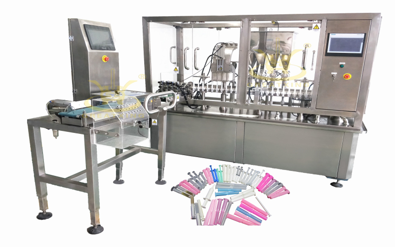 This machine is my company design a GX - ZNJ4 high-speed linear gel tube filling equipment, automatic cut pipe, mandrel push rod, and cover of vibration plate and wheel assembly host. Stable and reliable equipment, adopt PLC programming control, easy to operate, with no tube no filling and rodless detection features such as core is not filling. The machine is suitable for the needle type of gel, medicinal gel material, such as filling of department of gynaecology, widely used in pharmaceutical, cosmetic and scientific research, is the ideal gel syringes, needles, booster use packaging equipment.