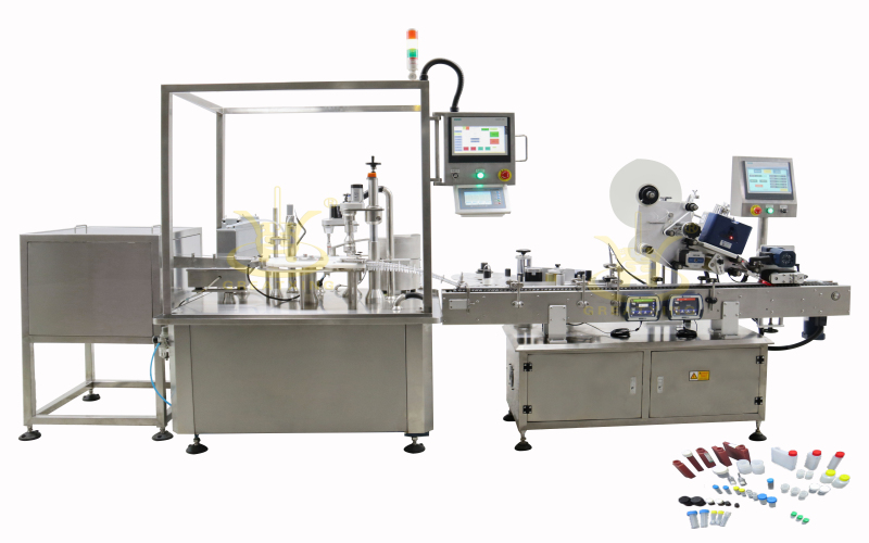 This line by for bottle - filling - prewhirl cover - screw cap - labeling - thermal transfer intelligent code unit in production line, is my company according to the requirement of the IVD industry research and design of intelligent to meet customer production requirements. High production efficiency, filling does not drip, the whole machine adopts PLC programmable controller to the automatic control of related functions, such as: no bottle no filling, do not cover, without cover or eliminate alarm function, the use of simple operation, easy to adjust. Equipment is mainly used for clinical biochemical reagents, immune diagnostic reagents, molecular diagnostic reagents, microbial diagnostic reagents, diagnostic reagents, urine clotting diagnostic reagents, hematology diagnostic reagents, flow cytometry diagnostic reagents and cleaning fluid automation packaging production line, etc.
